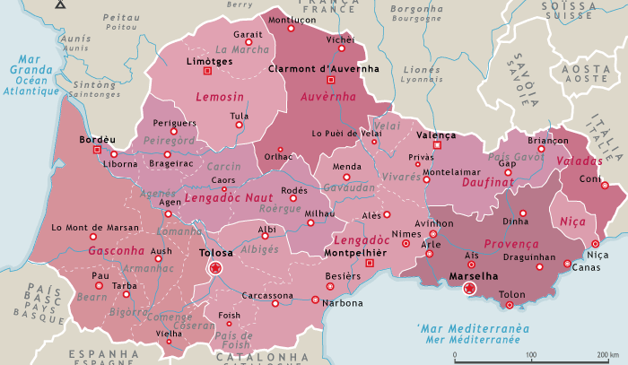 Les frontières des territoires occitanophones ont changé avec le temps. À l’heure actuelle, l’occitan est parlé dans trente-deux départements du sud de la France, dans le val d’Aran où il est langue co-officielle avec le catalan et le castillan, ainsi que dans douze vallées alpines d’Italie. Ce territoire est divisé en trois groupes de dialectes qui n’empêchent pas les locuteurs de se comprendre : le gascon, l’occitan central (languedocien, provençal), le nord-occitan (limousin, auvergnat, vivaro-alpin). Certains linguistes rattachent le catalan à l’occitan.