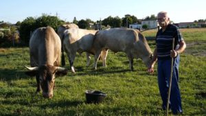 Jean-Pierre Dutreuilh est éleveur et maquignon à Birac, dans le Bazadais, comme son père et son grand-père. Il a toujours vécu au milieu des vaches et parle dans un gascon magnifique, d’un temps où les vaches peuplaient la campagne. Il nous fait partager son amour des bêtes et nous entraîne dans les prés au milieu de son troupeau, mais aussi au marché aux bestiaux à Agen et à la fête du Bœuf Gras à Bazas
